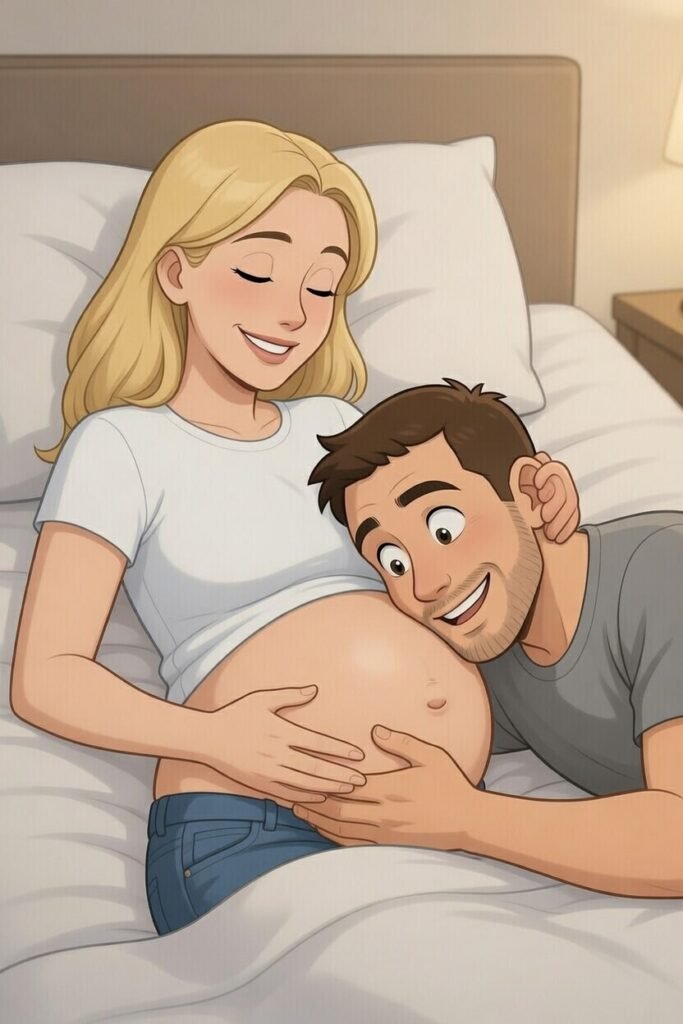 At night, winding down before going to sleep, Alberto uses Tessa’s belly as a pillow and starts to talk some nonsense to the baby. Suddenly his eyes become big. He checks Tessa’s heartbeat in her neck (to rule it out) and says: “I can hear the baby’s heartbeat! It goes like this.” and starts drumming the rhythm with his fingers on Tessa’s hand.