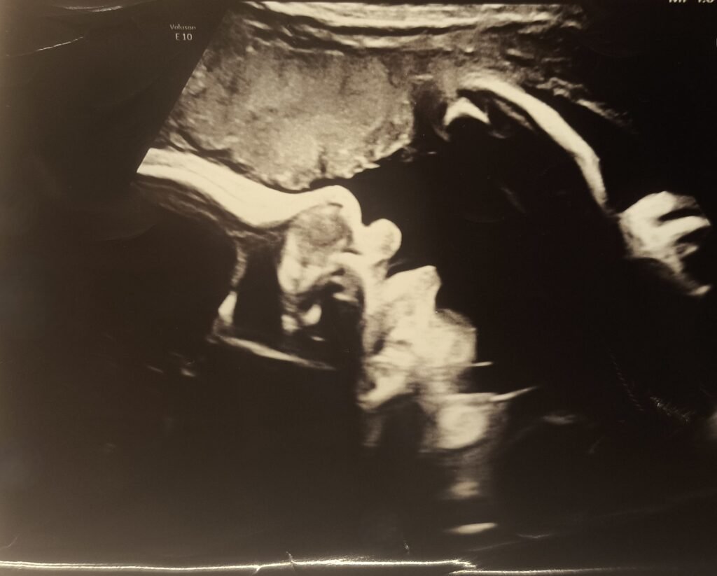 We are halfway. Time for another ultrasound. If you assume, half baked is half a baby you are sorely mistaken. During the 20-week scan we got to see organs, bones, blood flow through the heart and umbilical chord and so far everything looks as it should. The face profile shows us the cutest button nose and we can’t wait to meet our little munchkin. In the picture you can see the right foot.